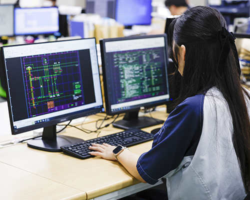 お客様から要望があった仕様を把握し、基本設計(配電盤の仕様や外形、電気回路設計、電気部品の選定)、詳細設計(構造図作成、板金・部品加工図の作成)を行います。又、必要に応じ、お客様との打ち合わせや、実際に設置される現地の調査など、オーダーメイドならではのお客様対応を行います。