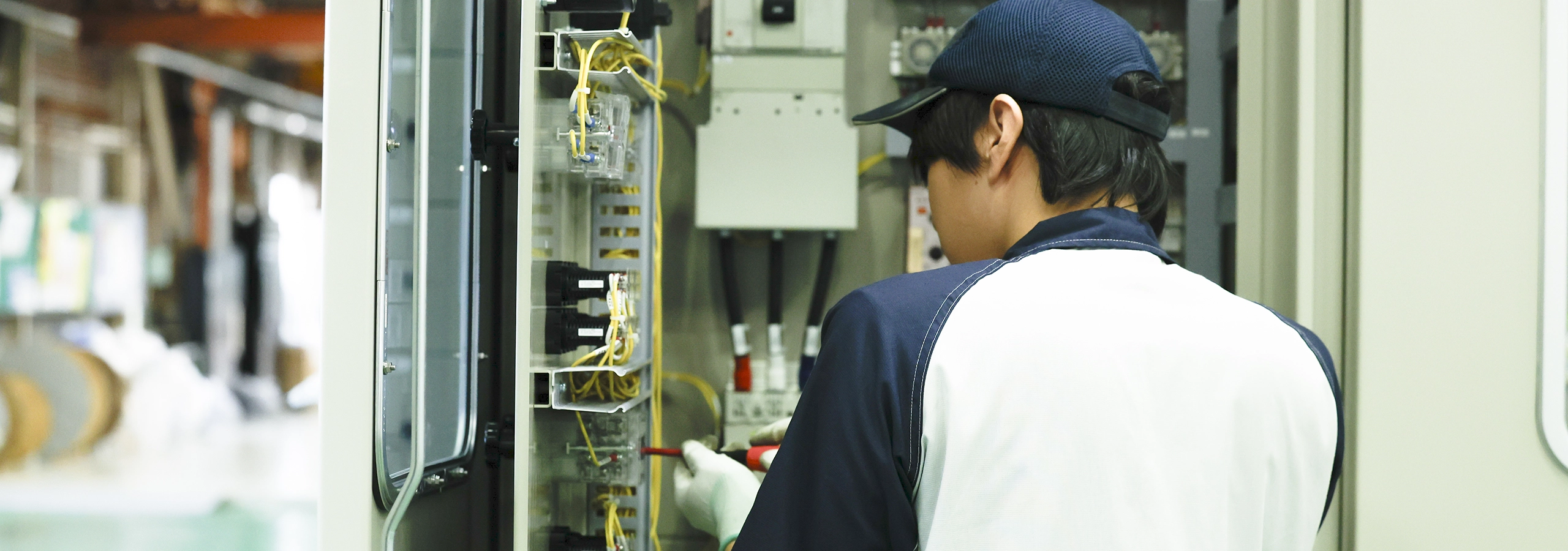 設計部門で作成した仕様書及び製作図面を基に配電盤を組み立てます。板金・塗装部門で製作した筐体や扉に電気機器類を組付けて配線を行い、製品化します。